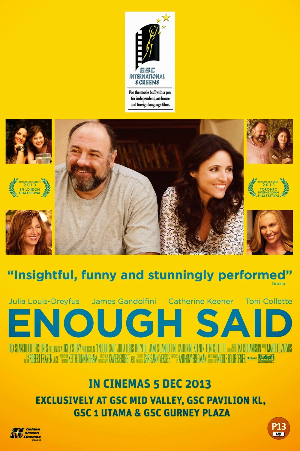 Enough Said: A divorced and single parent, Eva (Julia Louis-Dreyfus) spends her days enjoying work as a masseuse but dreading her daughter's impending departure for college. She meets Albert (James Gandolfini) - a sweet, funny and like-minded man also facing an empty nest. As their romance quickly blossoms, Eva befriends Marianne (Catherine Keener), her new massage client. Marianne is a beautiful poet who seems "almost perfect" except for one prominent quality: she rags on her ex-husband way too much. Suddenly, Eva finds herself doubting her own relationship with Albert as she learns the truth about Marianne's ex.